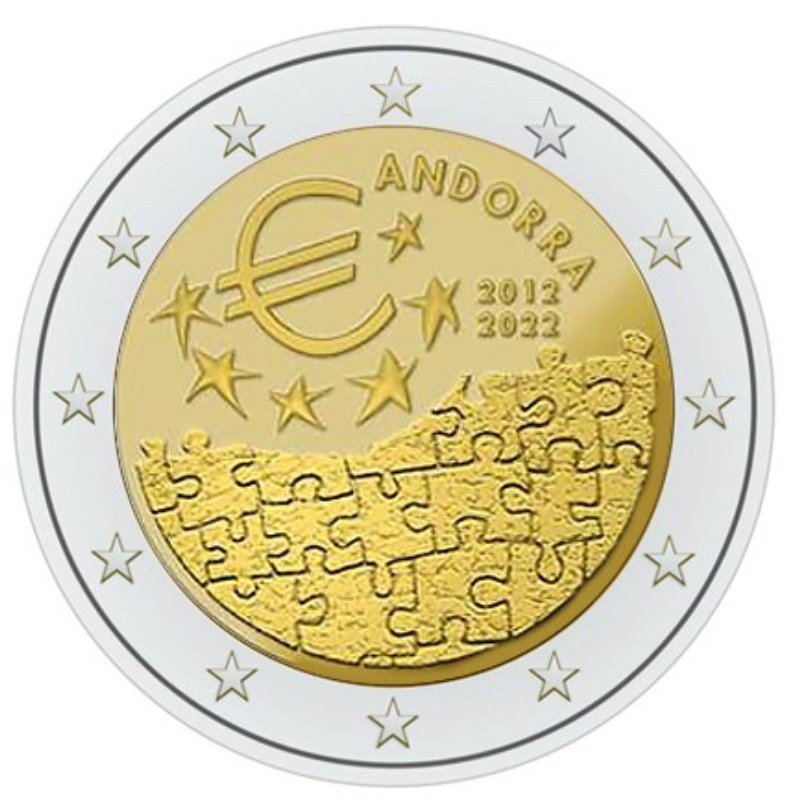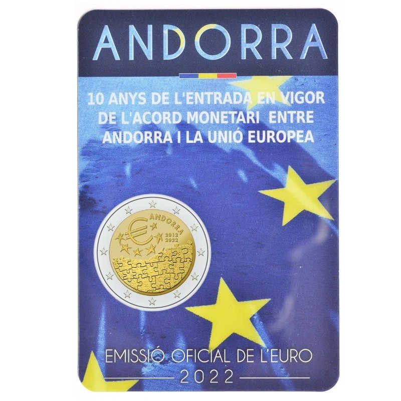 Žyma: 10 metų, 2 eurai, 2 euro, 2022, Andora, BU, euro įvedimas, Europos sąjunga, kortelė, moneta, moneta kortelėje, proginė, proginė moneta, susitarimas