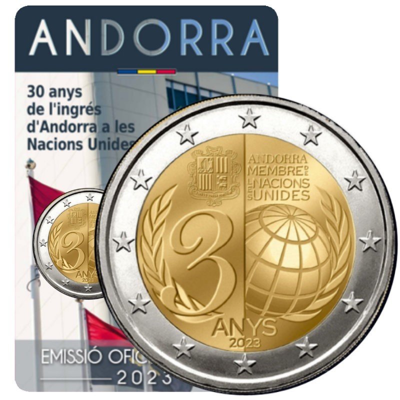 Andora 2023 2 euro proginė moneta bankinėje kortelėje – 30 metų narystei Jungtinėse Tautose (BU kokybė)