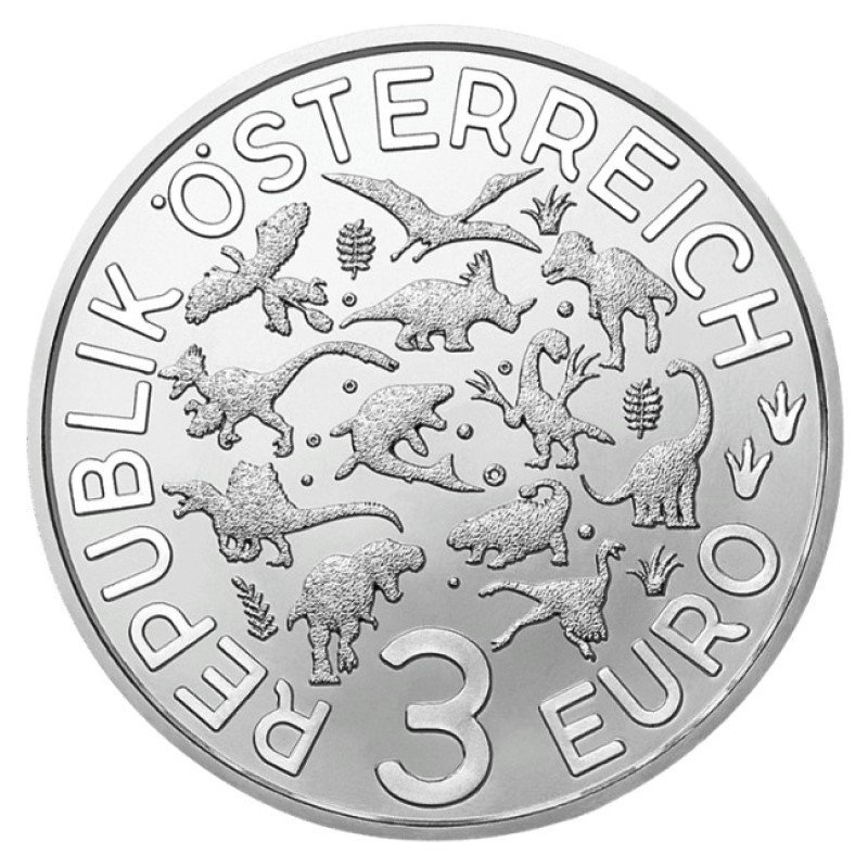 Žyma: 2022, 3 eurai, 3 euro, austrija, kolekcinė, microraptor, moneta, unc