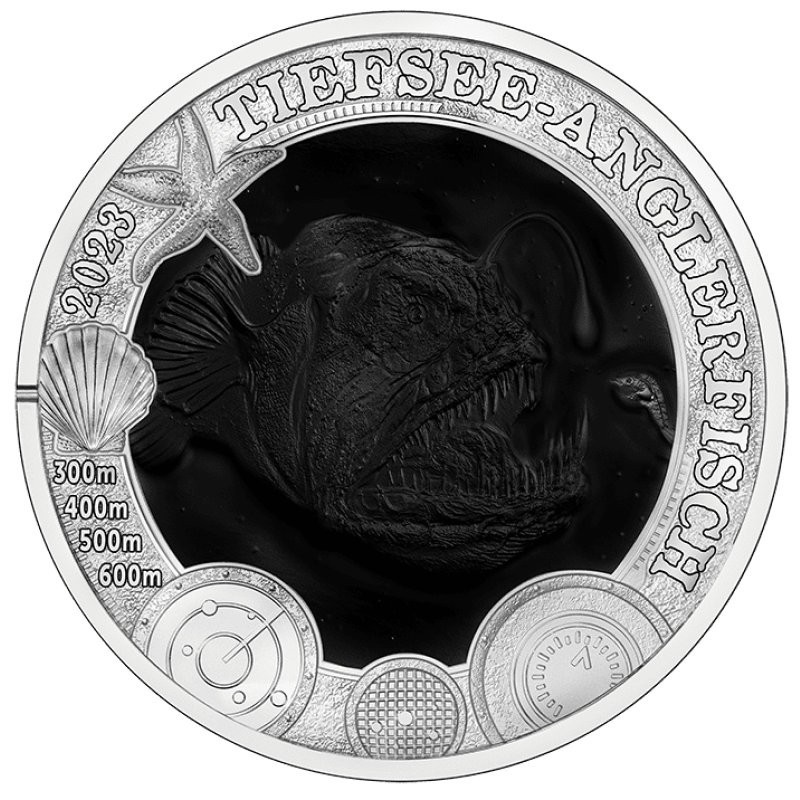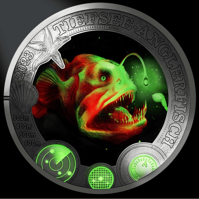 Tokios tamsios ir baisios, kaip pati giliai mėlyna jūra, tokios juodos monetos, kaip giliavandenė velniažuvė, dar nebuvo matyta. Kai apšviečiama ultravioletine šviesa, jos paslaptis atsiskleidžia – susiduriate akis į akį su baisia jūros pabaisa – juoduoju meškeriotoju. Tai ketvirtoji 3 eurų serijos „Švytintis vandens pasaulis” moneta, kuri negali būti dar labiau nepaprasta.