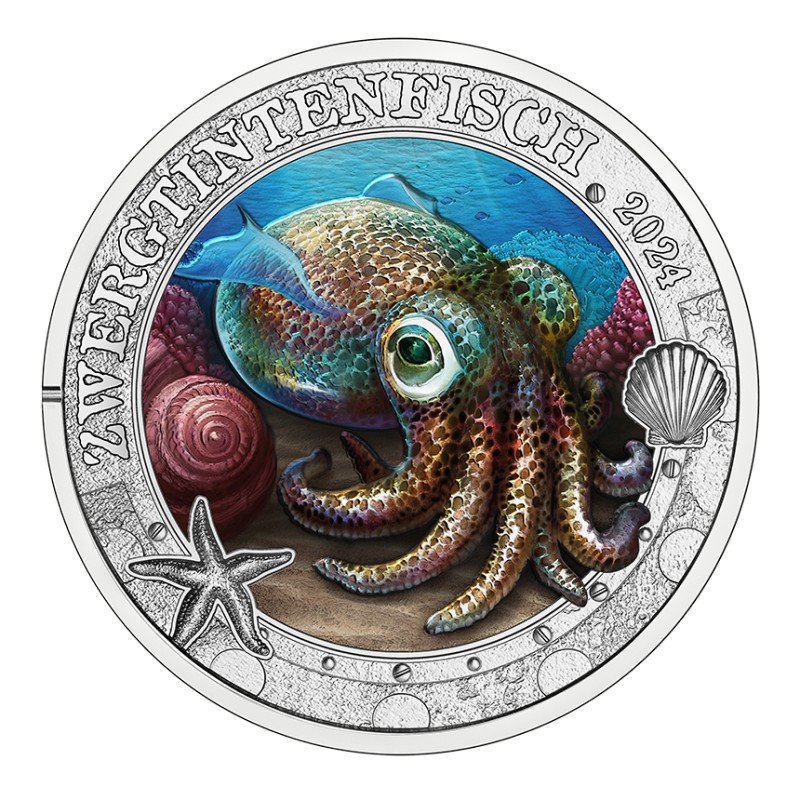 Austrija 2024 3 euro spalvota kolekcinė moneta švytinti UV spinduliuose – Havajų bobteilinis kalmaras.