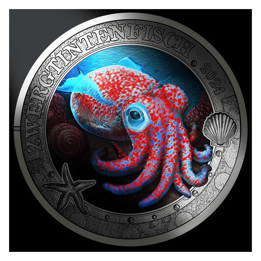 Žyma: 2024, 3 euro, austrija, Havajų bobteilinis kalmaras, kolekcinė, moneta, spalvota kolekcinė moneta, švytinti UV, unc