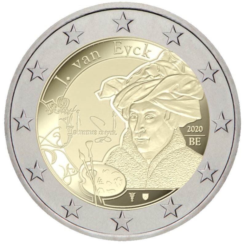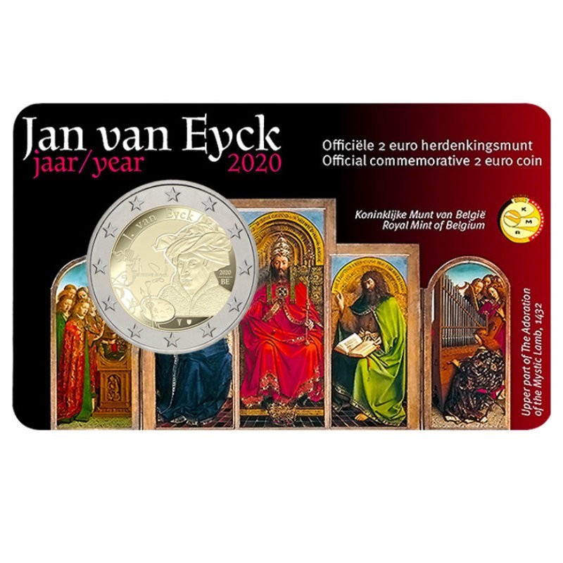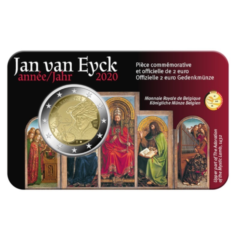 Žyma: 2 eurai, 2 euro, 2020, belgija, BU, eyck, jan, kalba, kortelė, moneta, moneta kortelėje, olandų, prancūzų, proginė, van, versija