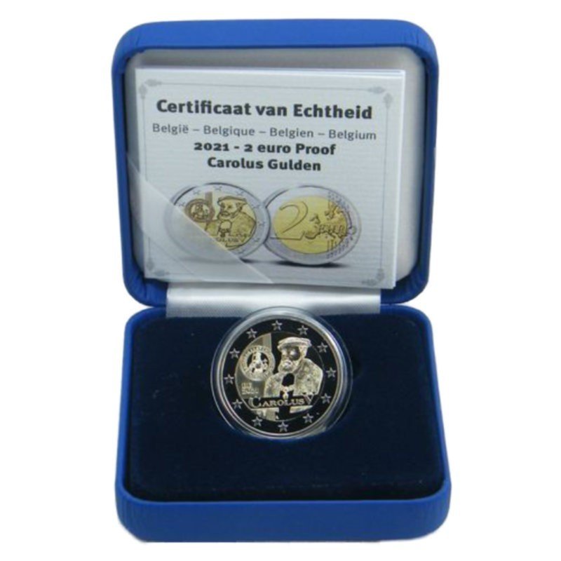 Žyma: 2 eurai, 2 euro, 2021, belgija, dėžutėje, karolis V, moneta, proginė, proof