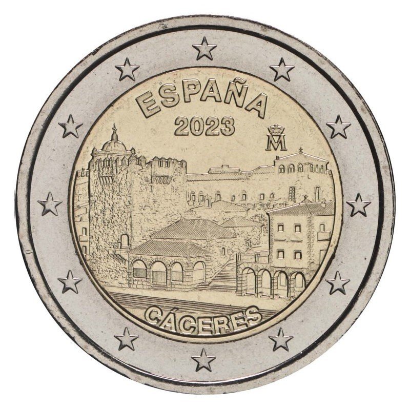 Žyma: 2 eurai, 2 euro, 2023, ispanija, Kaseresas, moneta, nacionalinis, proginė, unc