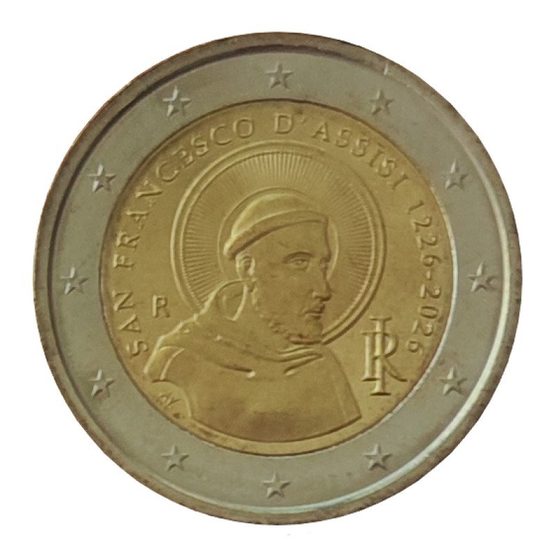 Žymos: 2 eurai, 2 euro, 2026, fdc, gimimo, italija, moneta, proginė, Šv. Pranciškus Asyžietis, unc