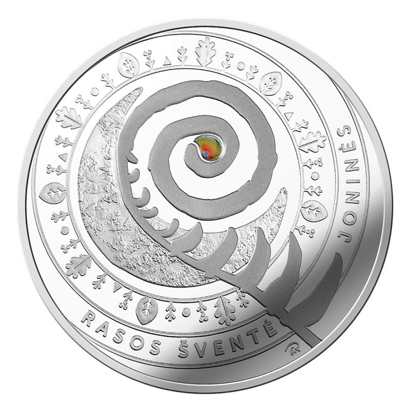 Žyma: 2018, 5 eurai, 5 euro, Ag925, bankinė dėžutė, Joninės, kolekcinė, Lietuva, moneta, proof, Rasos šventė, sertifikatas, sidabras