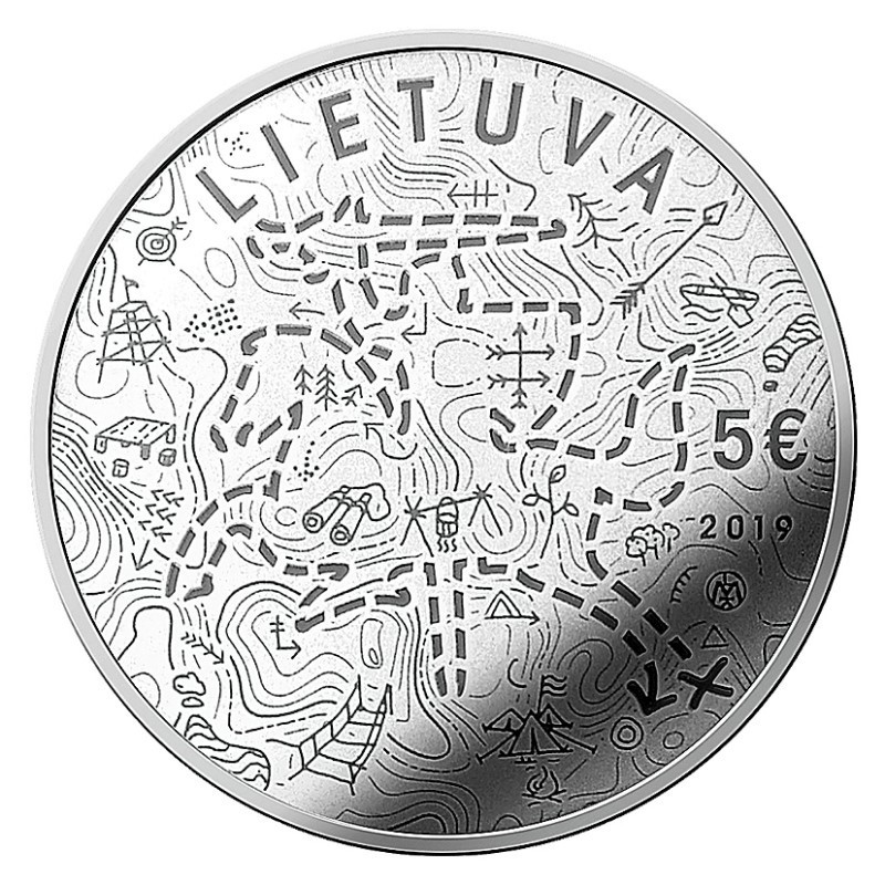 Žyma: 2019, 5 eurai, 5 euro, Ag925, kolekcinė, Lietuva, moneta, proof, sidabras, skautai, skautams
