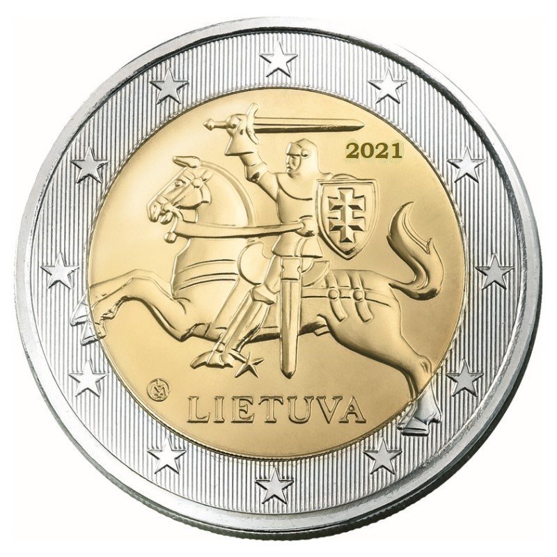 Žyma: 2 eurai, 2 euro, 2021, Lietuva, moneta, nacionalinė, unc