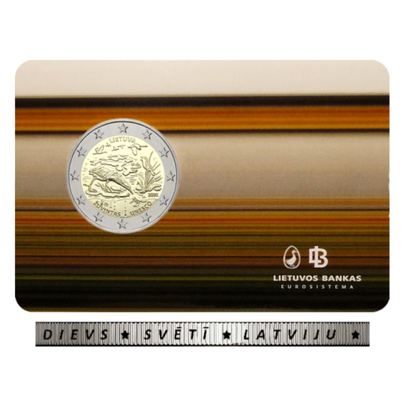 Lietuva 2021 2 euro proginė moneta su kalyklos klaida (latviškas tekstas gurte) banko kortelėje – Žuvinto rezervatas (BU kokybė)