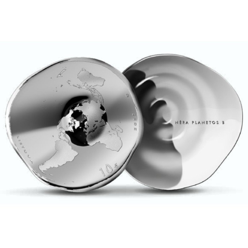 Žyma: 10 eurų, 2022, Ag925, elipsės formos, kolekcinė, Lietuva, moneta, nėra planetos B, nestandartinė, proof, sfera, sidabras, Žemė planeta