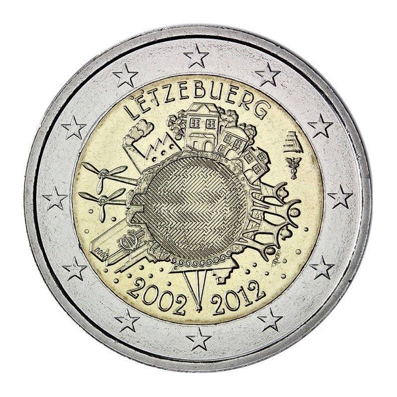 Žyma: 10, 2 eurai, 2 euro, 2012, dešimt, eurui, liuksemburgas, metų, moneta, proginė, tye, unc