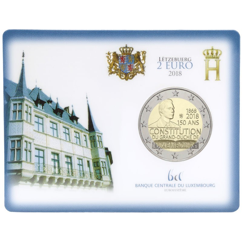 Liuksemburgas 2018 2 euro proginė moneta bankinėje kortelėje – Konstitucijos 150-metis (BU kokybė)
