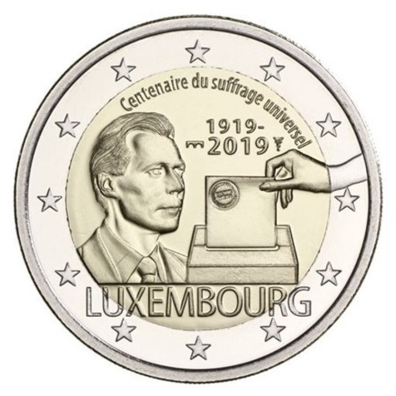 Žyma: 2 eurai, 2 euro, 2019, BU, kortelė, liuksemburgas, moneta, proginė, rinkimų, teisė, visuotinė