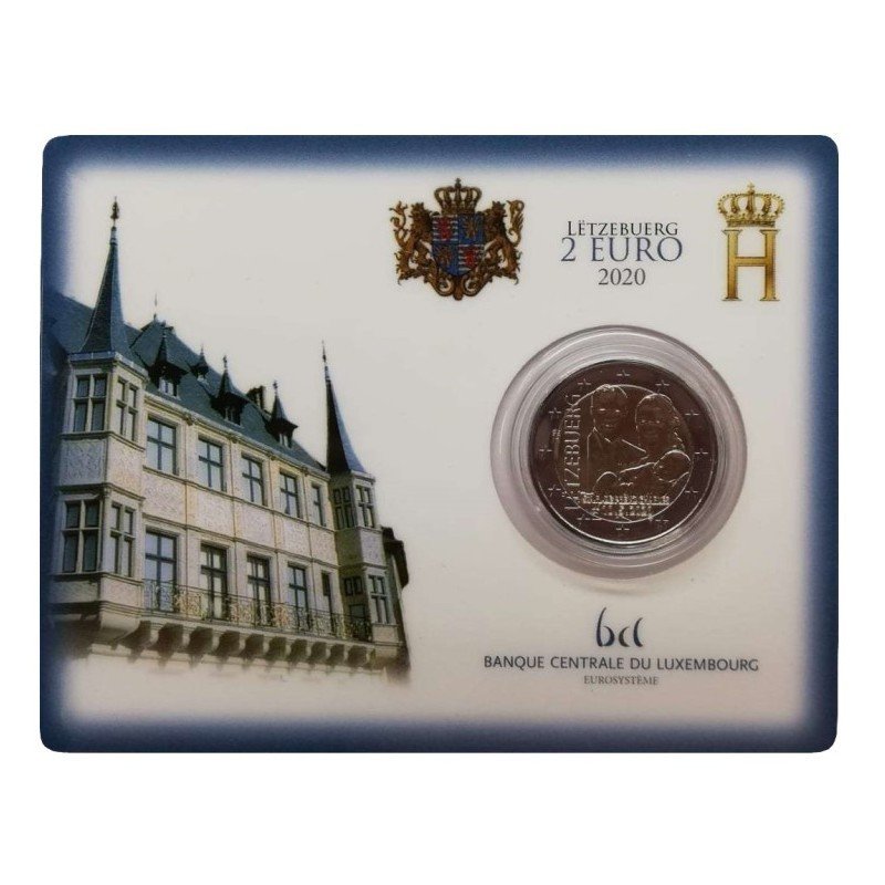 Žyma: 2 eurai, 2 euro, 2020, BU, charles, gimimas, kortelė, liuksemburgas, moneta, princo, proginė, reljefas