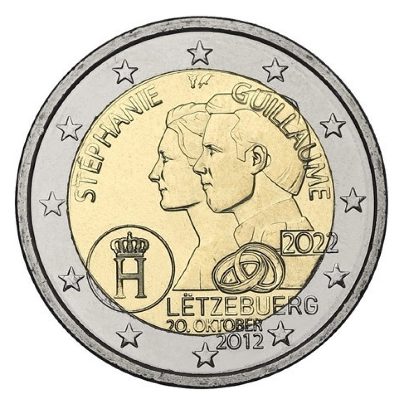 Žyma: 10 metų, 2 eurai, 2 euro, 2022, liuksemburgas, moneta, proginė, unc, vestuvės