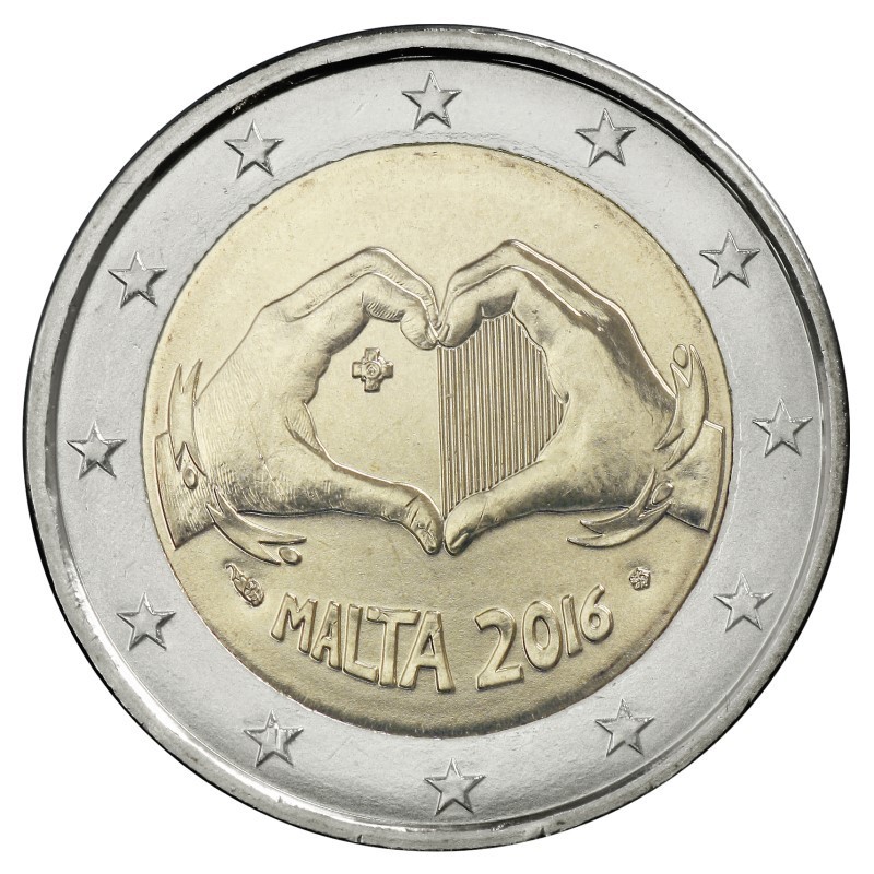 Žyma: 2 eurai, 2 euro, 2016, malta, meilė, moneta, moneta kortelėje, Moneta su kalyklos ženklais., proginė, unc