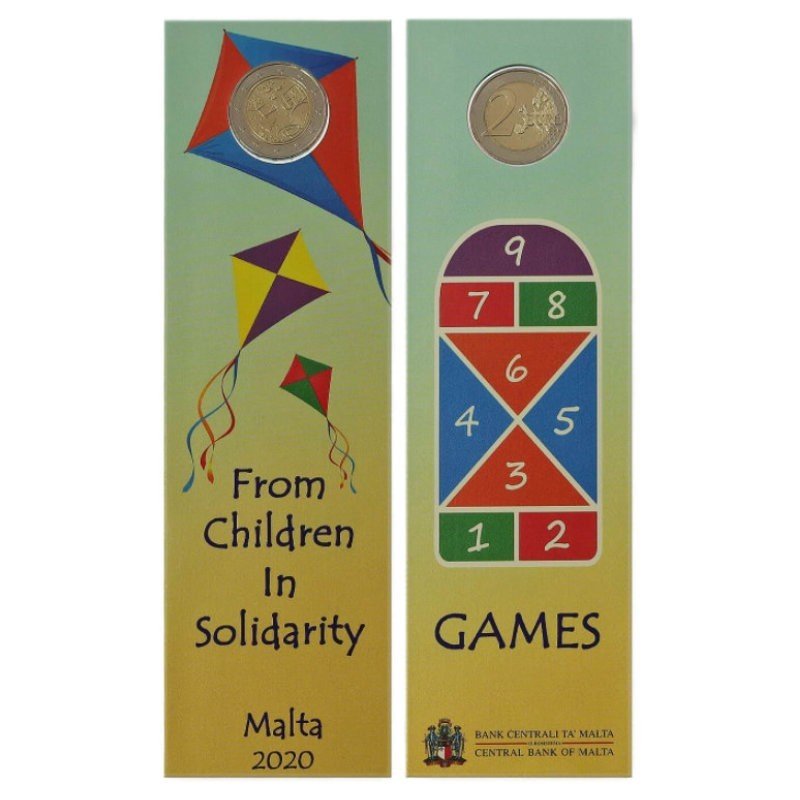 Žyma: 2 eurai, 2 euro, 2020, BU, kortelė, malta, moneta, Moneta su kalyklos ženklais., proginė, žaidimai