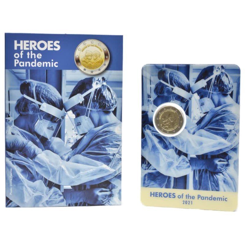 Žyma: 2 eurai, 2 euro, 2021, BU, herojai, kortelė, malta, moneta, moneta kortelėje, pandemijos, proginė