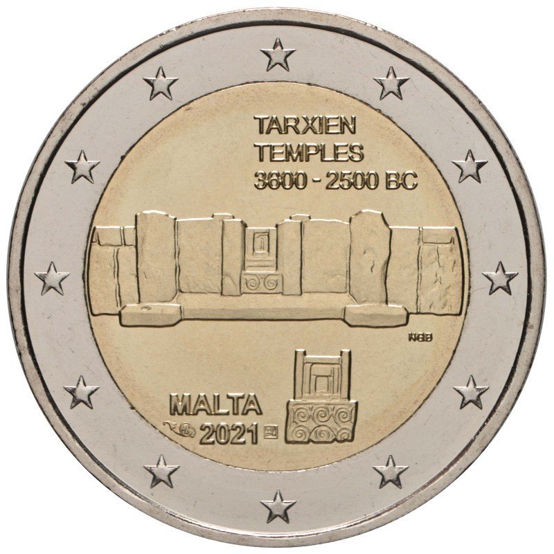 Žyma: 2 eurai, 2 euro, 2021, BU, BU kortelė, kortelė, malta, moneta, moneta kortelėje, Moneta su kalyklos ženklais., proginė, šventykla, Tarxien