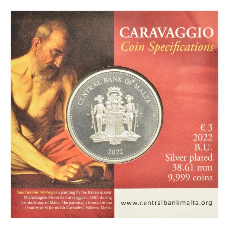 Malta 2022 3 euro kolekcinė moneta bankinėje kortelėje – Caravaggio-St. Jerome Writing (BU kokybė)