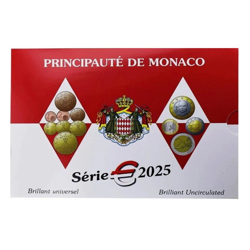 Monakas 2025 oficialus euro monetų rinkinys su 1 euro ir 2 euro naujo dizaino monetomis (BU)