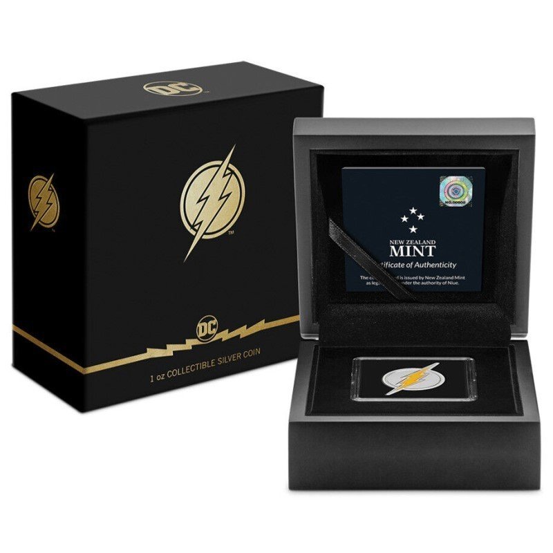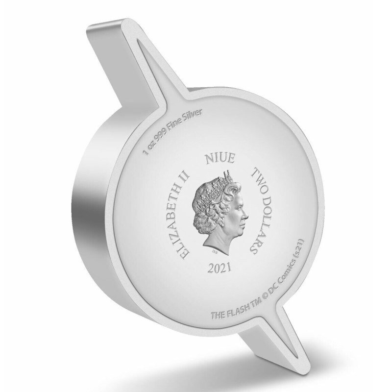 Žyma: 1 oz, 2 doleriai, 2021, Ag999, bankinė dėžutė, Blyksnis, kolekcinė, logo, moneta, Niujė, proof, sidabras, spalvota, Žaibas