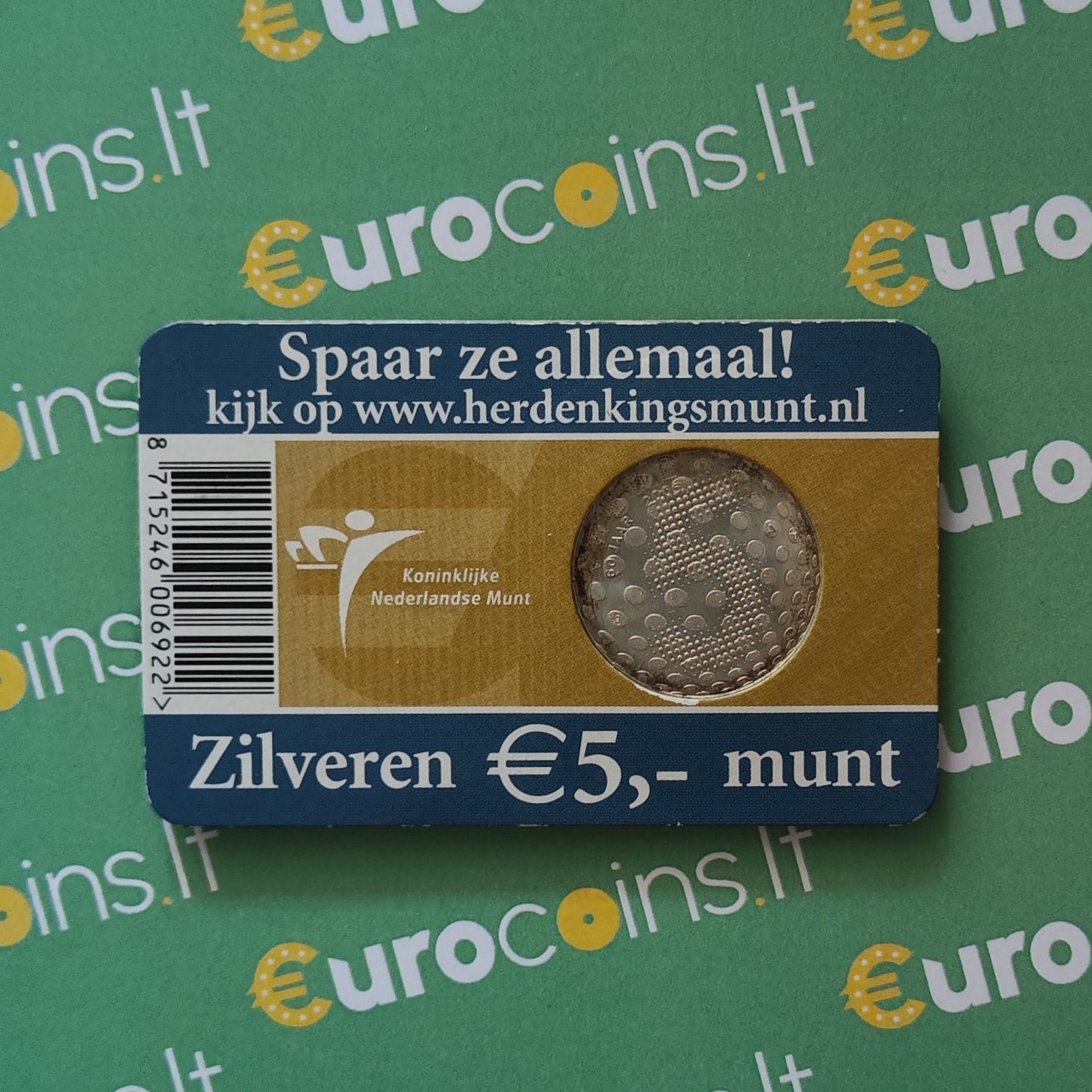 Žyma: 2005, 5 euro, 60-osios išsivadavimo metinės, 60-osios metinės, BU, išsivadavimas, kolekcinė sidabrinė moneta, kortelė, moneta, moneta kortelėje, nyderlandai, olandija, proginė, sidabras