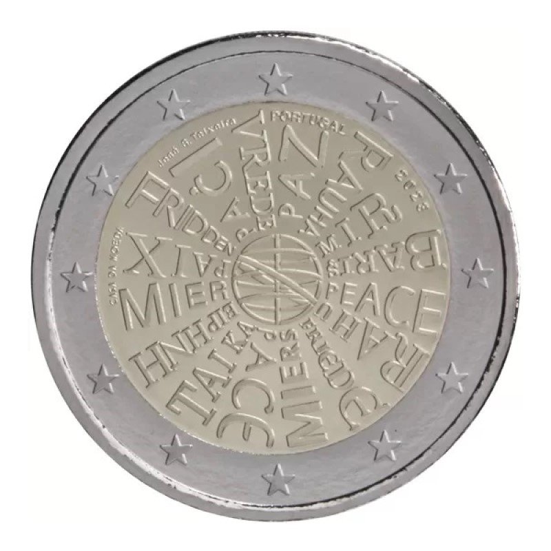 Žyma: 2 eurai, 2 euro, 2023, moneta, portugalija, proginė, taika, unc