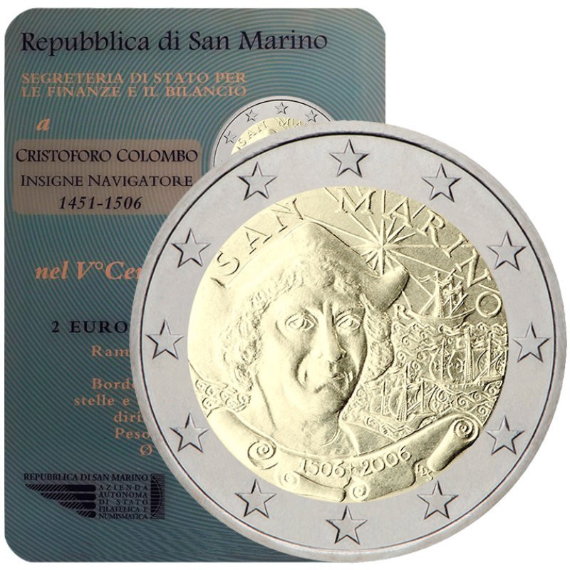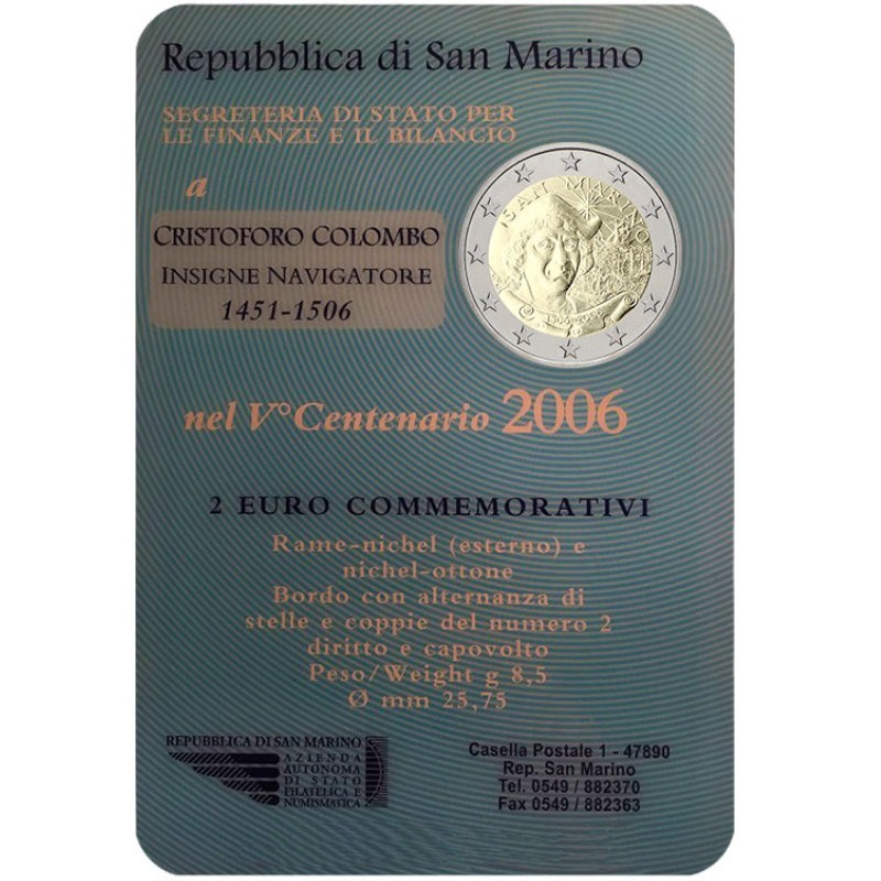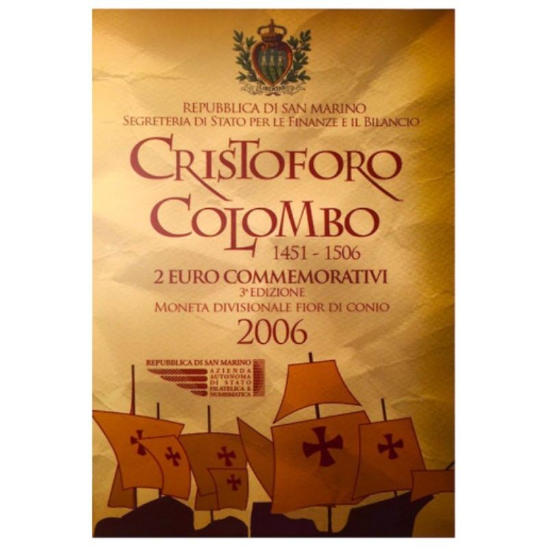 Žyma: 2 eurai, 2 euro, 2006, BU, Kolumbas, kortelė, Kristupas, proginė moneta, San Marinas