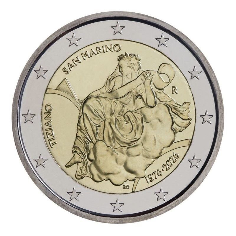 Žymos: 2 eurai, 2 euro, 2026, 450-osios metinės, 450-osios mirties metinės, BU, kortelė, proginė moneta, San Marinas, Ticiano