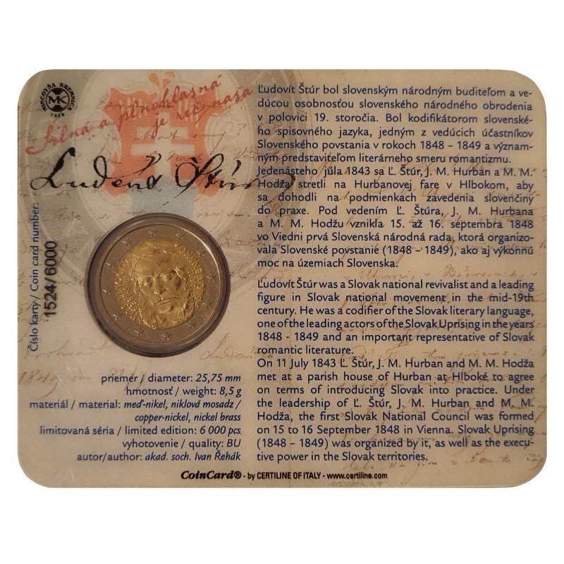 Slovakija 2015 2 euro proginė moneta bankinėje kortelėje – Ludovit Štur gimimo 200-metis (BU kokybė)