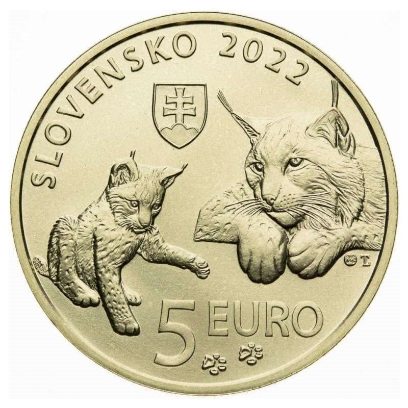 Žyma: 2022, 5 eurai, 5 euro, kolekcinė, lūšis, moneta, slovakija, unc