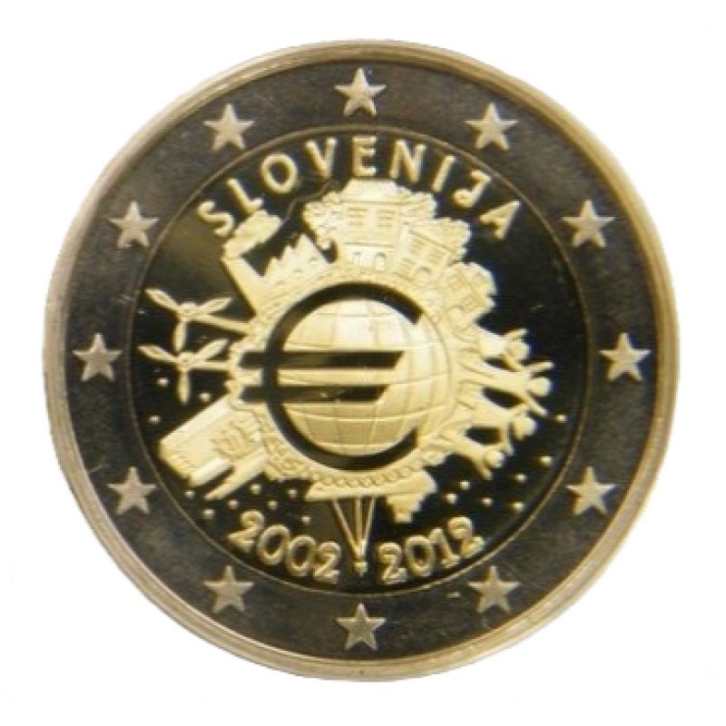 Žyma: 10, 2 eurai, 2 euro, 2012, dešimt, eurui, metų, moneta, moneta kapsulėje, proginė, proof, slovėnija, tye