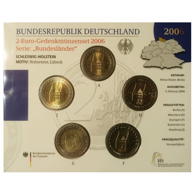 Vokietija 2006 2 euro proginės monetos kortelėje – Šlėzvigas-Holšteinas A-D-F-G-J (BU)