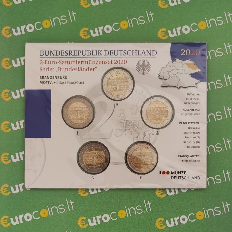 Žyma: 2 eurai, 2 euro, 2020, Brandenburgas, BU, kortelė, moneta, proginė, proginės monetos, rinkinys, visos kalyklos, vokietija