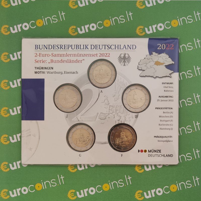Vokietija 2022 2 euro proginės monetos bankinėje kortelėje – Tiuringija*Vartburgo pilis A-D-F-G-J (BU kokybė)