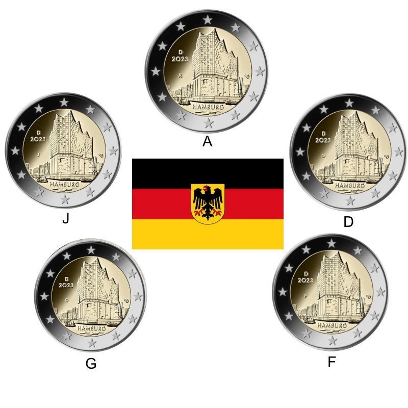 Vokietija 2023 2 euro proginės monetos – Hamburgas*Elbės filharmonija (A, D, F, G, J)