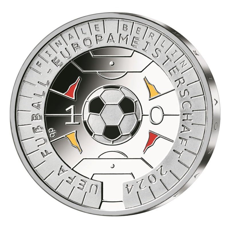 Žyma: 11 euro, 2024, 5 euro, BU, kolekcinė, moneta, sidabrinė, spalvota kolekcinė moneta, uefa, vokietija