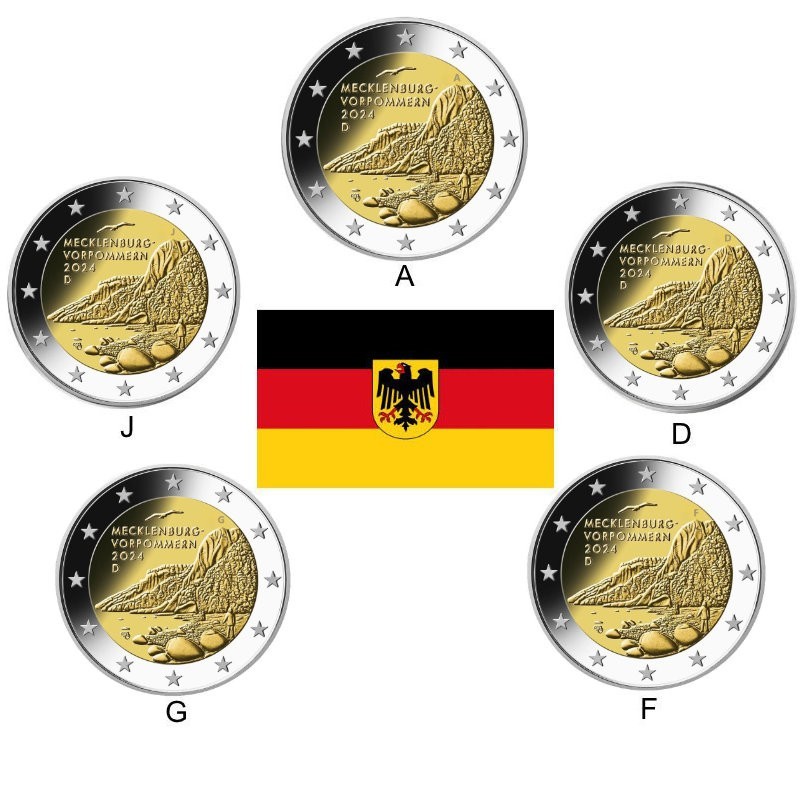 Vokietija 2024 2 euro proginės monetos – Meklenburgas-Pomeranija (visos kalyklos – A, D, F, G, J)