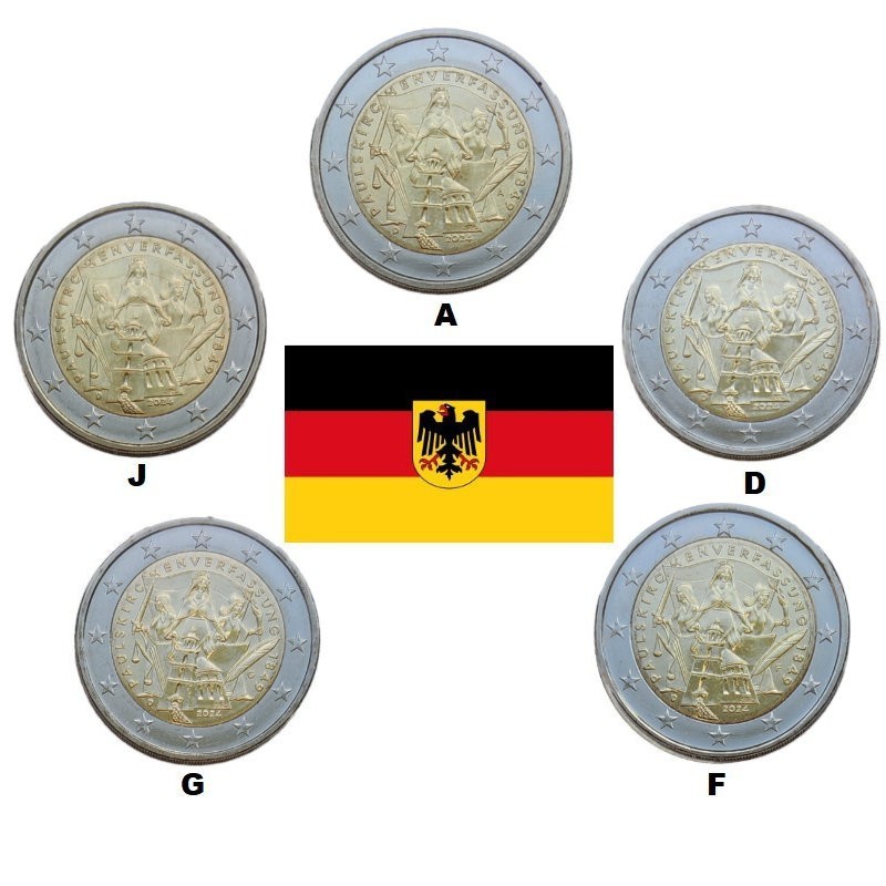 Vokietija 2024 2 euro proginės monetos – 175 metai Šv. Pauliaus bažnyčios konstitucijai (visos kalyklos – A, D, F, G, J)