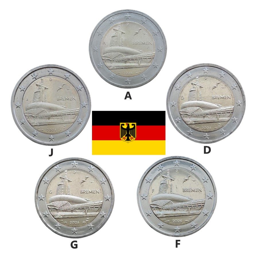 Vokietija 2026 2 euro proginės monetos – Bremenas (visos kalyklos – A, D, F, G, J)